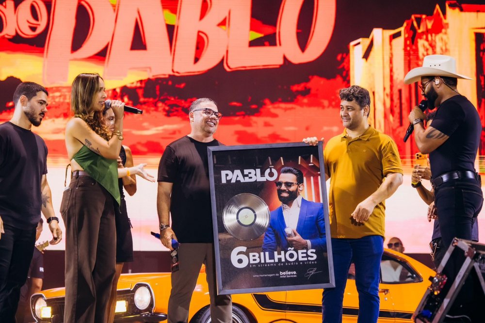 Um dos pontos altos do evento foi a homenagem recebida por Pablo no palco, celebrando a marca de 6 bilhões de reproduções nas plataformas digitais, além de mais de 253 milhões de plays do projeto “Bodega das Bodegas” — números que reforçam a força do artista no cenário musical.